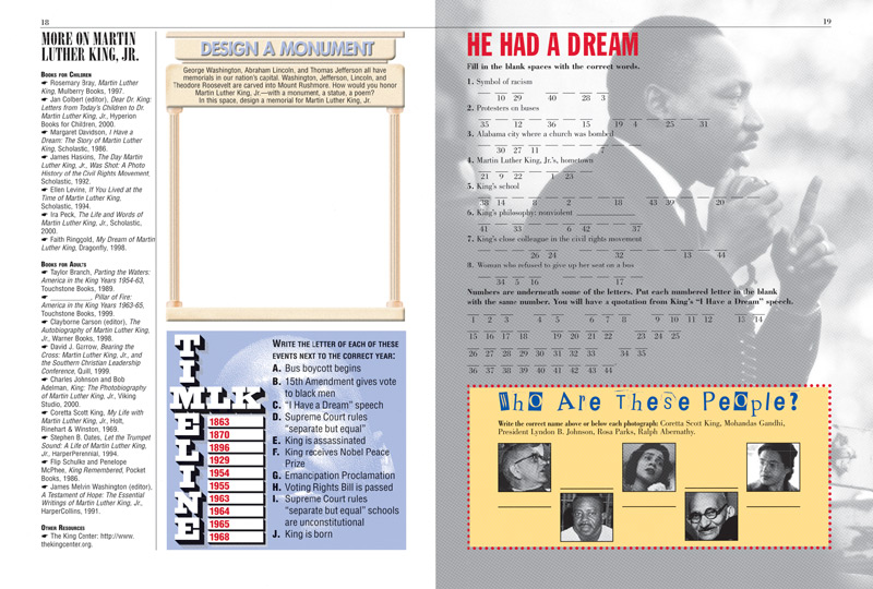 Martin Luther King, Jr. preached love and believed nonviolent protest was the only way to freedom and equality for black Americans, and in return for his vision of peace. he was arrested, stabbed, and finally assassinated. Despite his tragic and untimely death, many successes filled the life of Martin Luther King, Jr., as kids will discover in this issue. For one thing, his tireless efforts to improve the lives of millions of Americans garnered him the Nobel Peace Prize at the young age of 35.