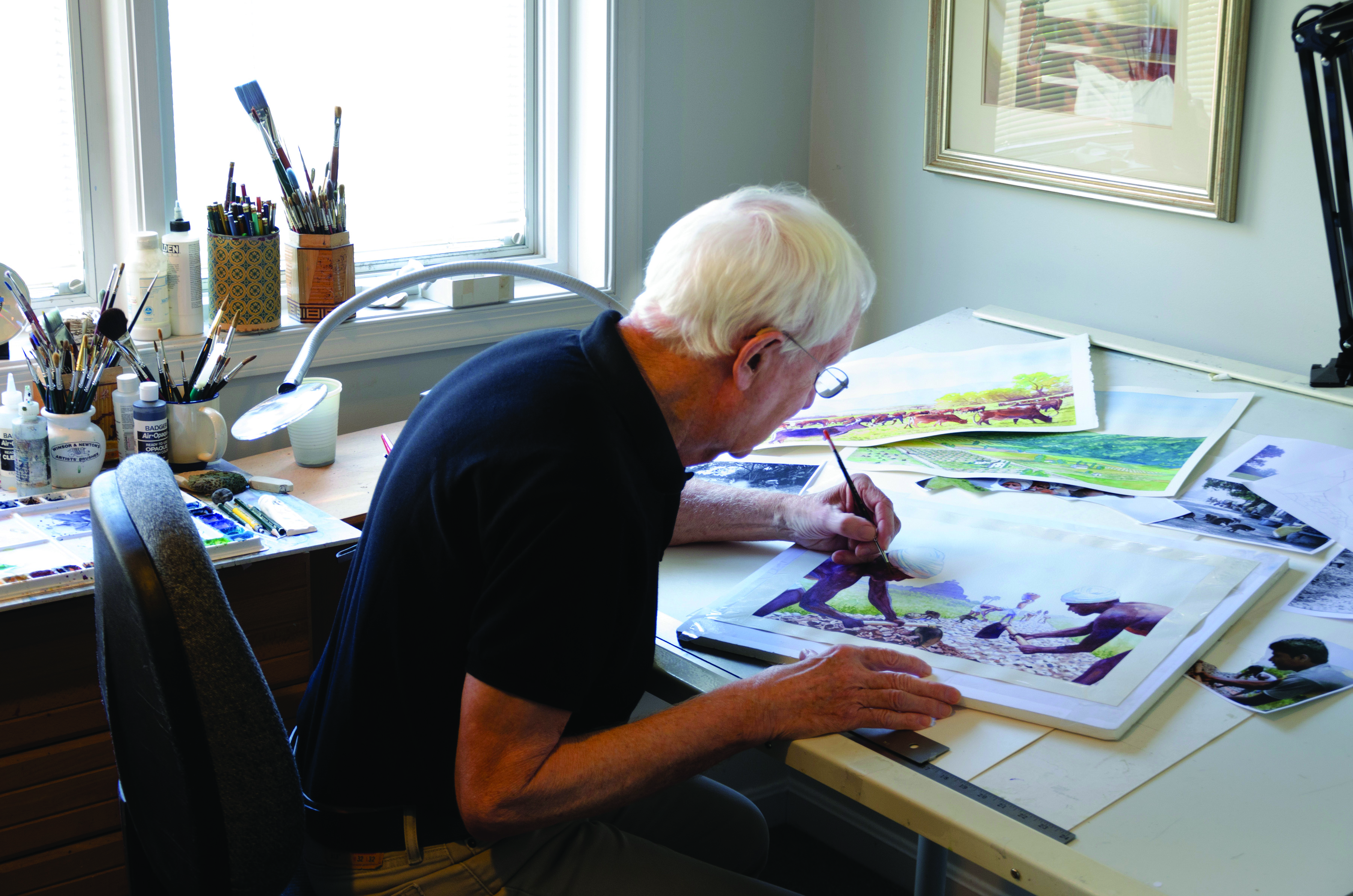 Artist Rob Wood finishes the final details on a watercolor painting, to be featured in an upcoming issue of Kids Discover.